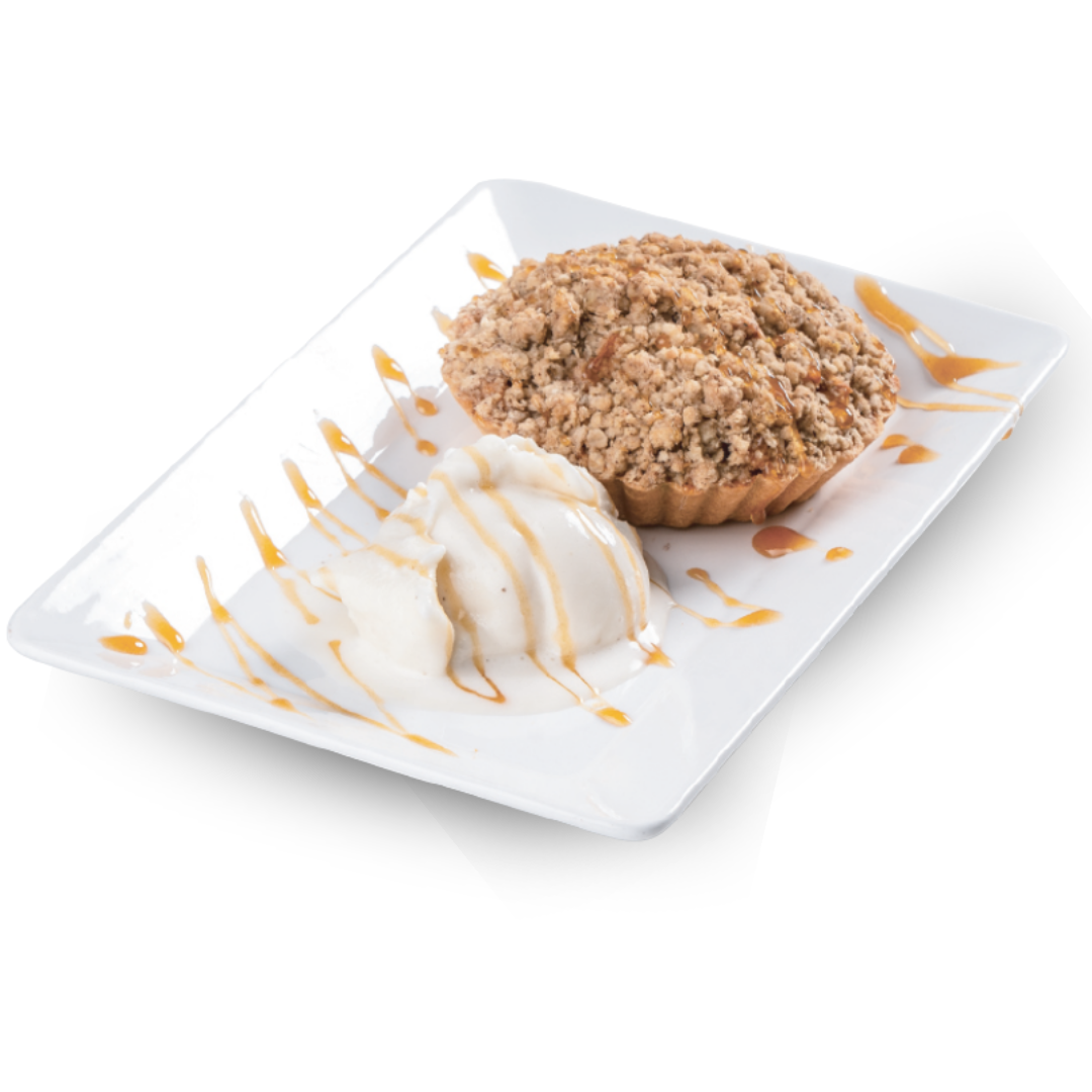 Warm apple pie with spiced apples, finished with a buttery crumble and vanilla ice cream.