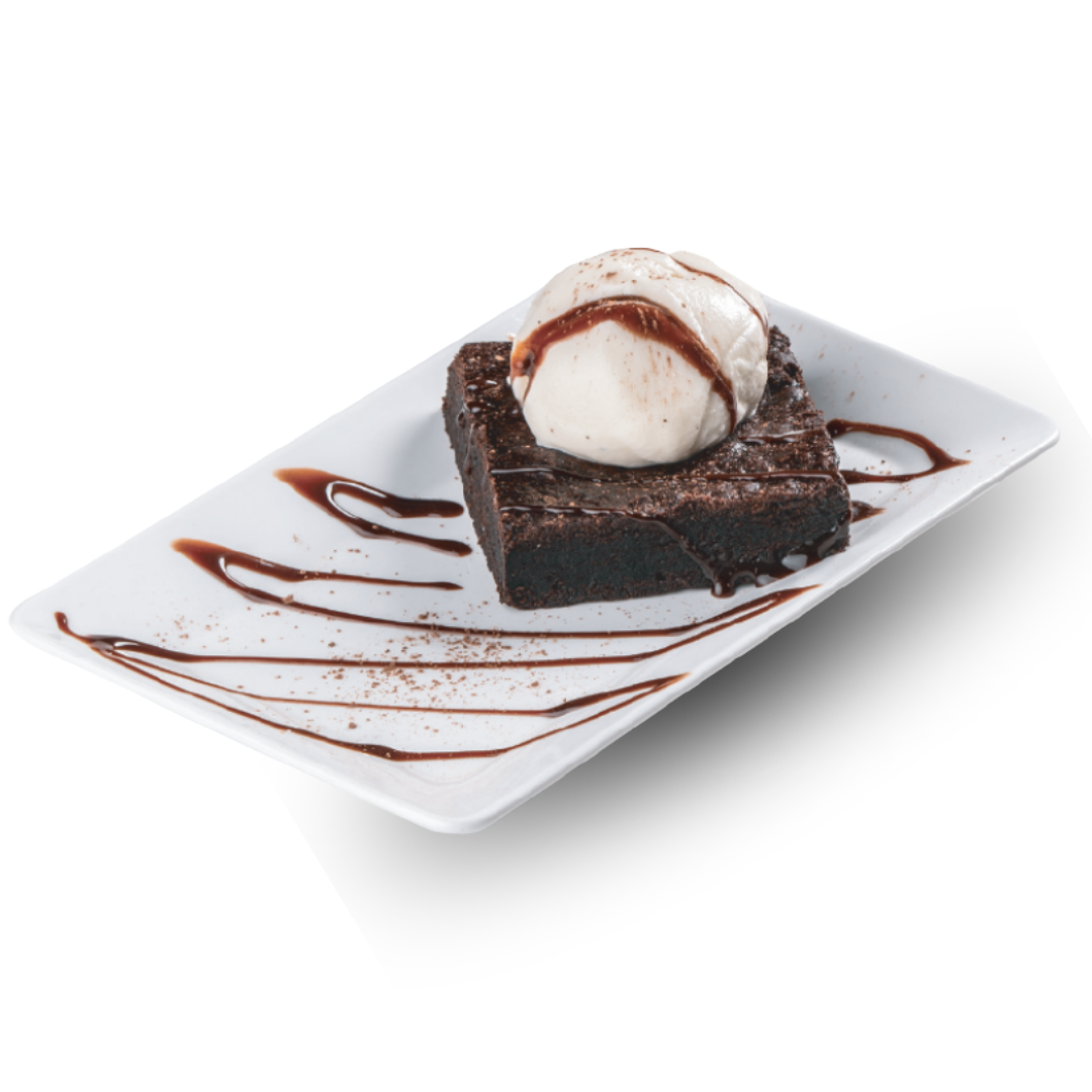 Rich chocolate brownie topped with vanilla ice cream and chocolate drizzle.